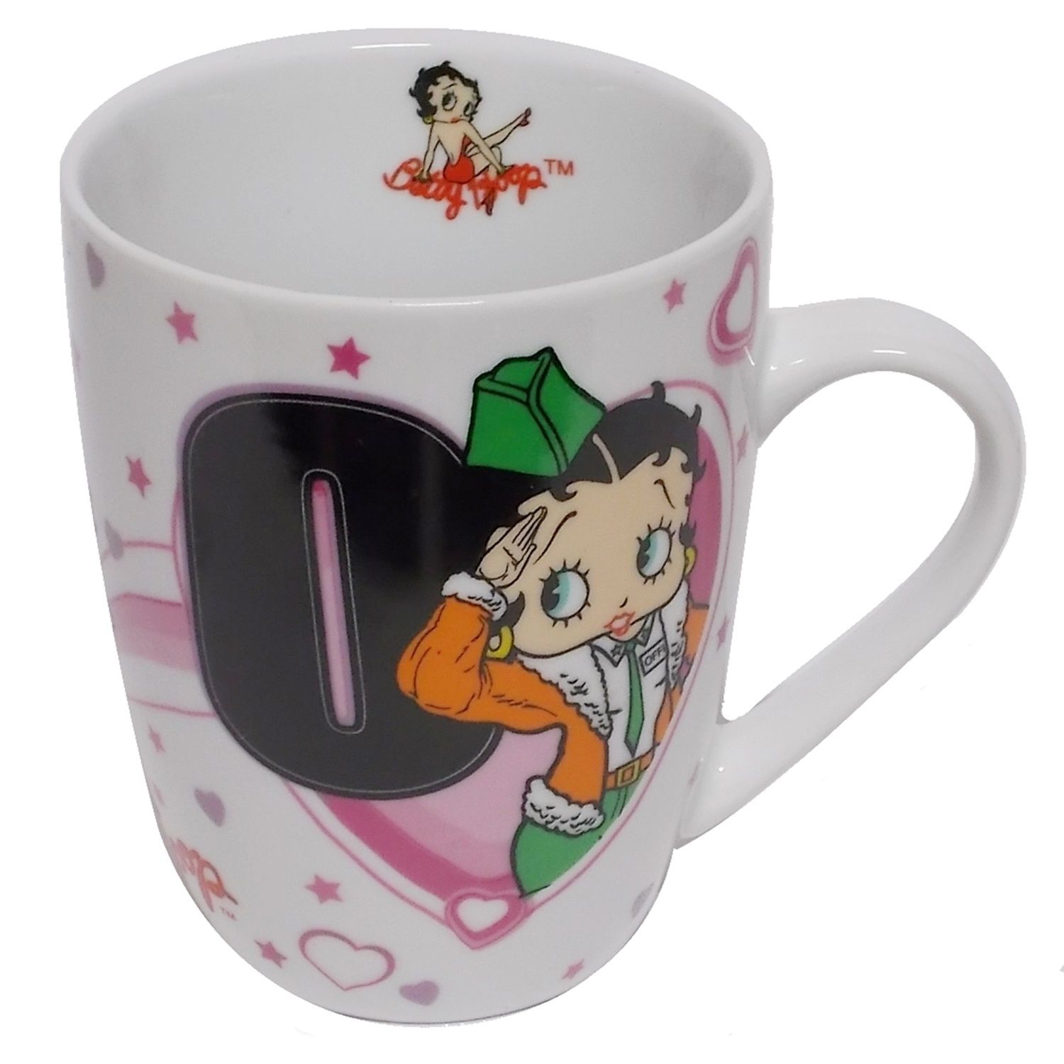 Tazza in ceramica con immagine di Betty Boop e lettera, ogni lettera ha immagini diverse nella tazza, con scatola in cartone stampato.